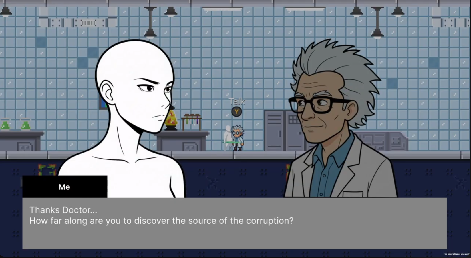 The game includes features such as a cutscene with voice acting, dialogue introductory scene, inventory system and store vendors, and dialogue interactions that inform you how to progress.